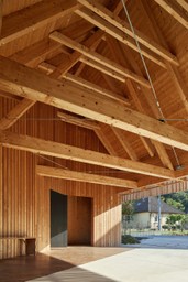 The property is thus dominated by the grey, roughly plastered remnants of the mill, inside which a piece of the original technology has been preserved – an almost 200-year-old oak hopper on which the millstone was mounted. A hole has been cut into the massive wall, and into it the architects have mounted a modern frameless window with a spruce scuncheon. The roof is new, too, and stands out thanks to the subdued white colour of the gable. Nevertheless, some original elements have been preserved, such as the steel windows with small windowpanes and an inclined wooden beam that acts as a lintel above the door.